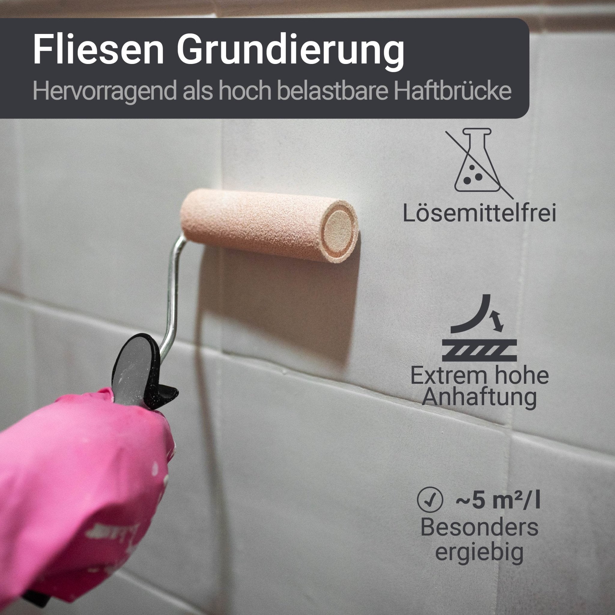 • Solvent-free special primer based on polymer dispersion to optimize the adhesion of tile paints on all ceramic and mineral substrates