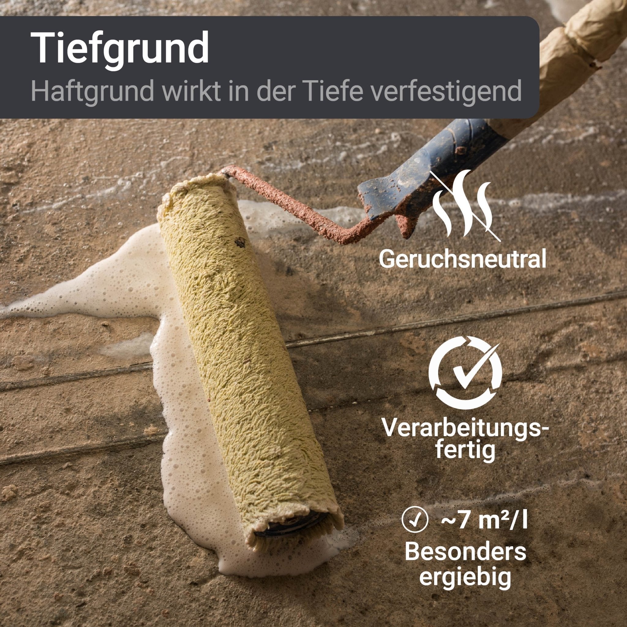 • Tiefengrund is suitable as a primer for substrates such as cement and lime cement plaster, cement screed, gypsum, plaster and concrete, etc.