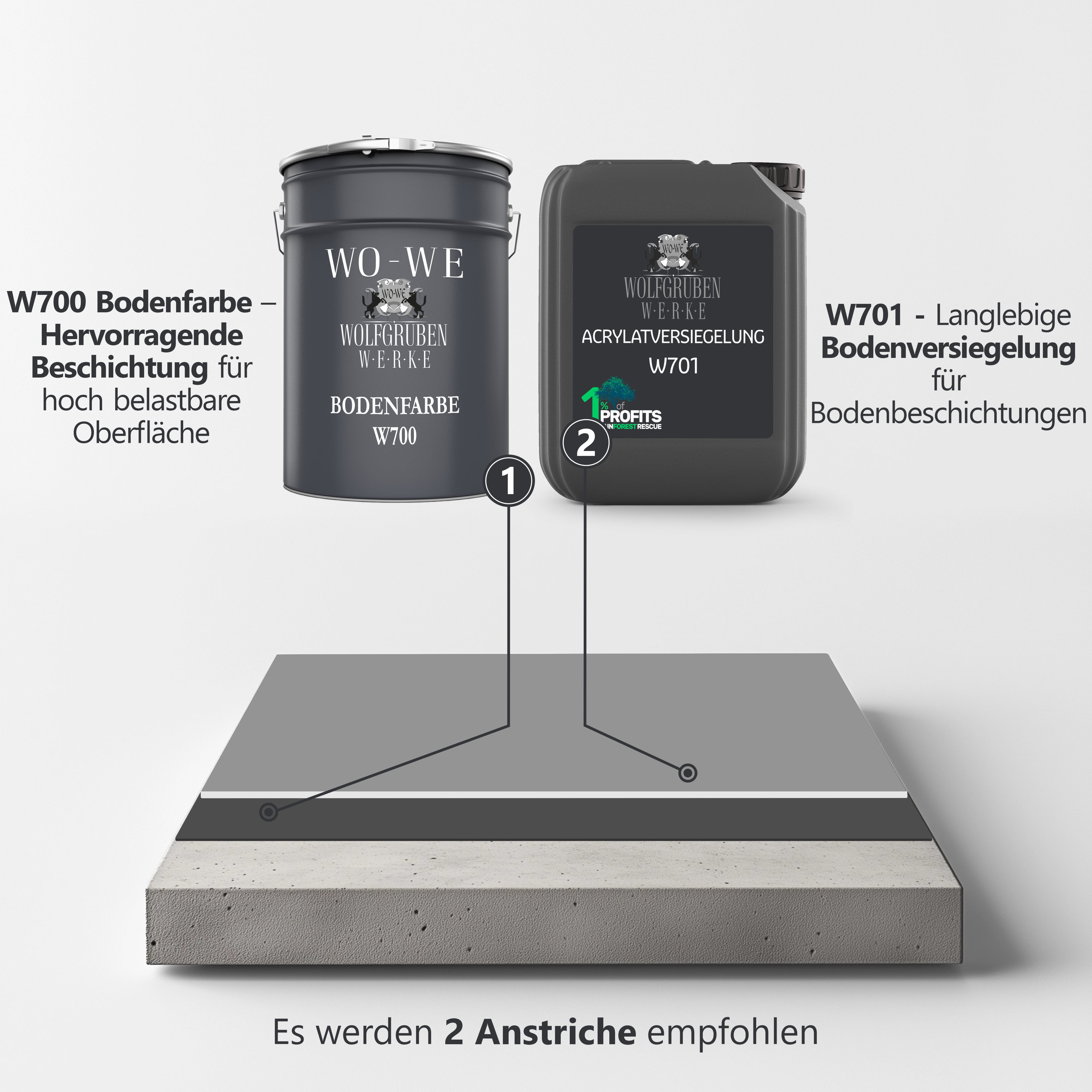 Pour les garages et autres sols à passage intense, nous recommandons notre Résine époxy W702 (couche coloré + couche incolore final) au lieu de la combinaison de la peinture pour sol W700 et du scellant acrylique W701 en raison de sa durabilité nettement supérieure.