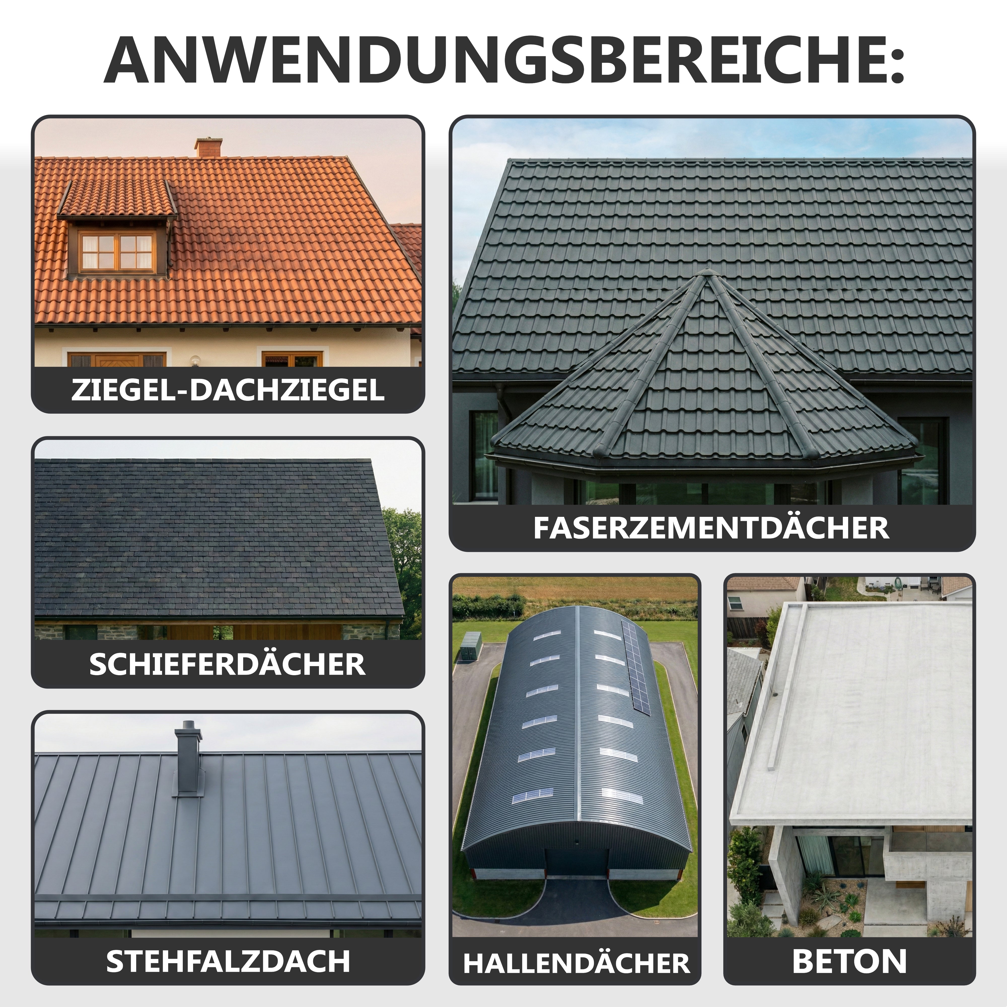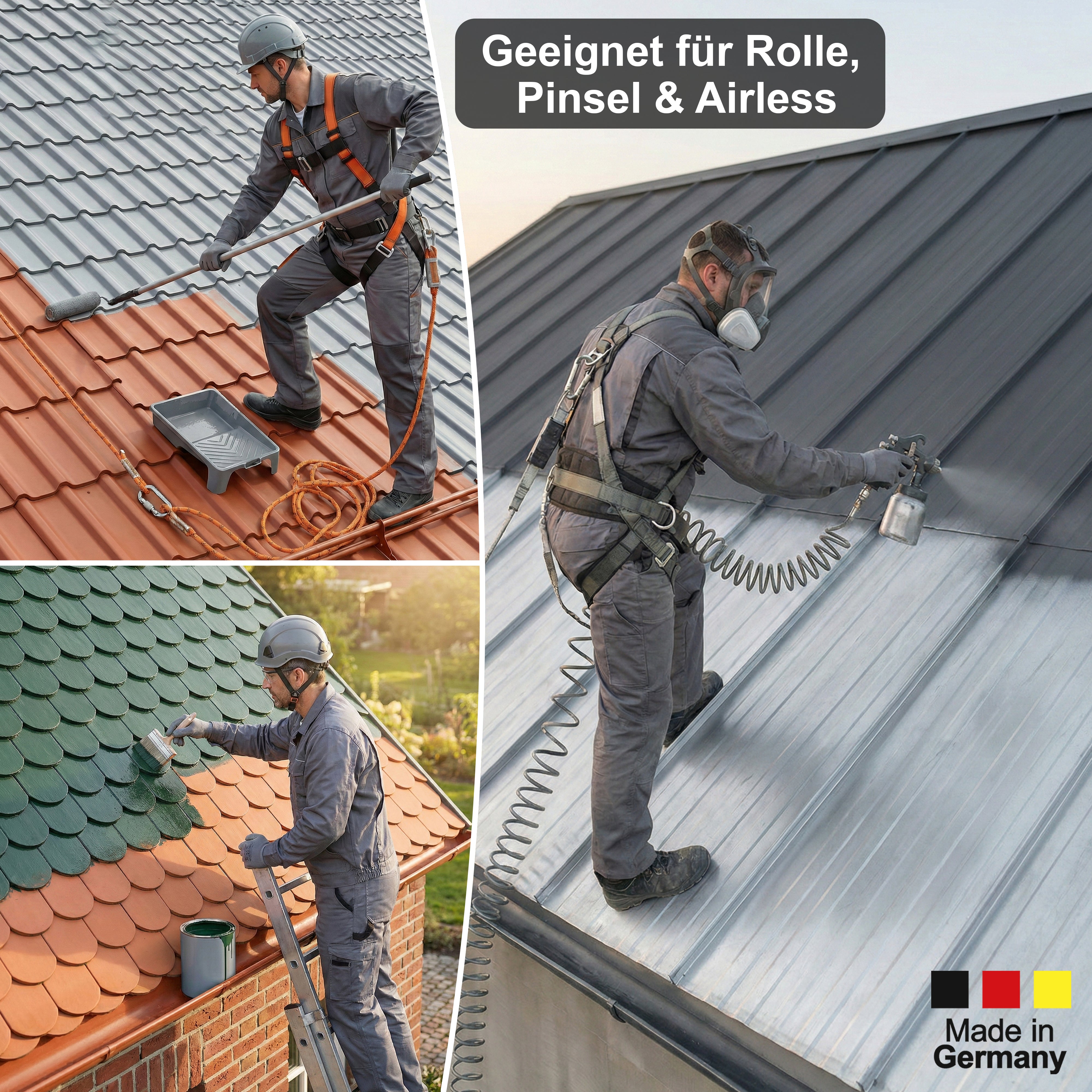 Cette peinture de qualité, fabriqué en Allemagne, convient pour la rénovation de tous types de toitures: ardoises, tuiles, terre cuite ou ciment, tôle, briques, métal, bois.